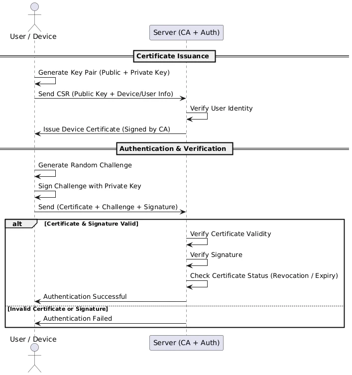 Device sends the signed challenge + certificate to the server.